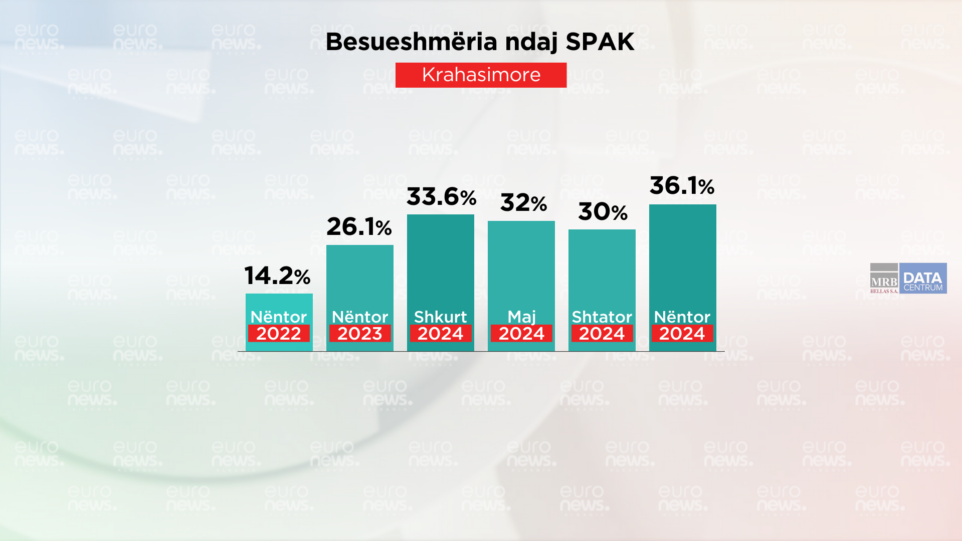 Nga matjet periodike të bëra nga Barometri për besueshmërinë e institucioneve nga nëntori i vitit 2022 e deri sot në matjet e fundit, rezulton se besueshmëria për SPAK-un në matjet e fundit është me larta e kësaj periudhe matjesh. Nëse analizojmë shifrat e besueshmërinë në periudha të ndryshme nga 14.2% që ishte besueshmëria për këtë institucion në fillimet e tij, në një vit u dyfishua me 26.1%, u rrit në 33,6% në shkurt të vitit pasardhës, pati një rënie në 32% në maj të 2024 me 32%, edhe një rënie tjetër në shtator të këtij viti me 30% për tu rritur në matjen e fundit në shifrën më të lartë të kësaj periudhe matjesh.
