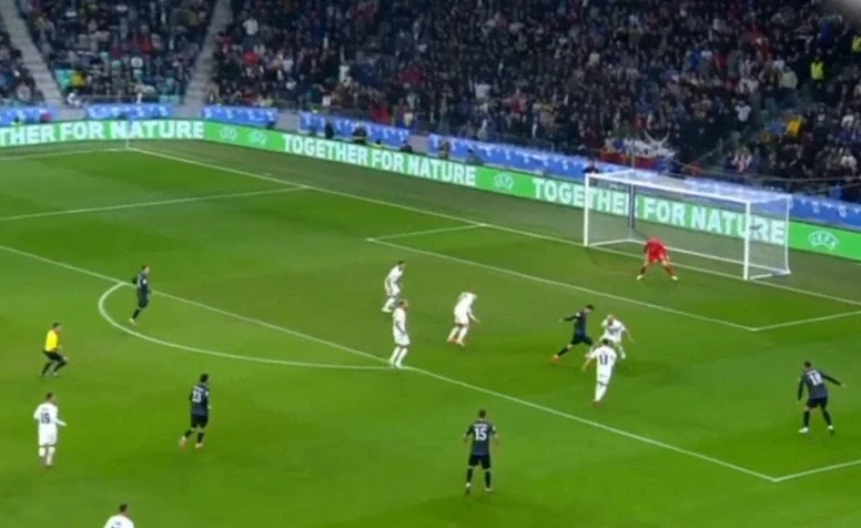 Asllani e pranoi topin në zonë, u shmang bukur nga një mbrojtës, dhe për mrekulli realizoi me gjuajtje zhargas në portën e Jan Oblakut për 1:0.