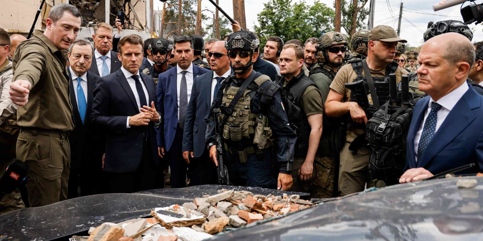 Italian Prime Minister Mario Draghi (2L) French President Emmanuel Macron (3L) and German Chancellor Olaf Scholz (R) visit Irpin on June 16, 2022. It is the first time that the leaders of the three European Union countries have visited Kyiv since Russia's February 24 invasion of Ukraine. They are due to meet Ukrainian President Volodymyr Zelensky, at a time when Kyiv is pushing for membership of the EU. (Photo by Ludovic MARIN / POOL / AFP)