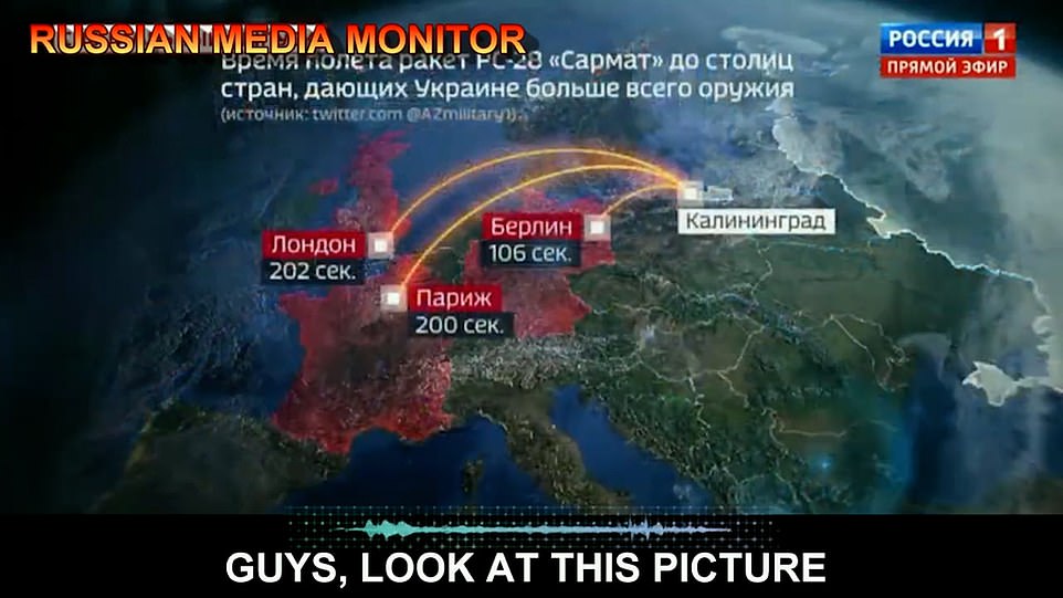 Drejtuesit e emisionit “60 minuta” në televizionin “Channel One” thanë se qytetet e Londrës, Parisit dhe Berlinit, mund të goditeshin brenda 200 sekondave nga lëshimi i raketave bërthamore.