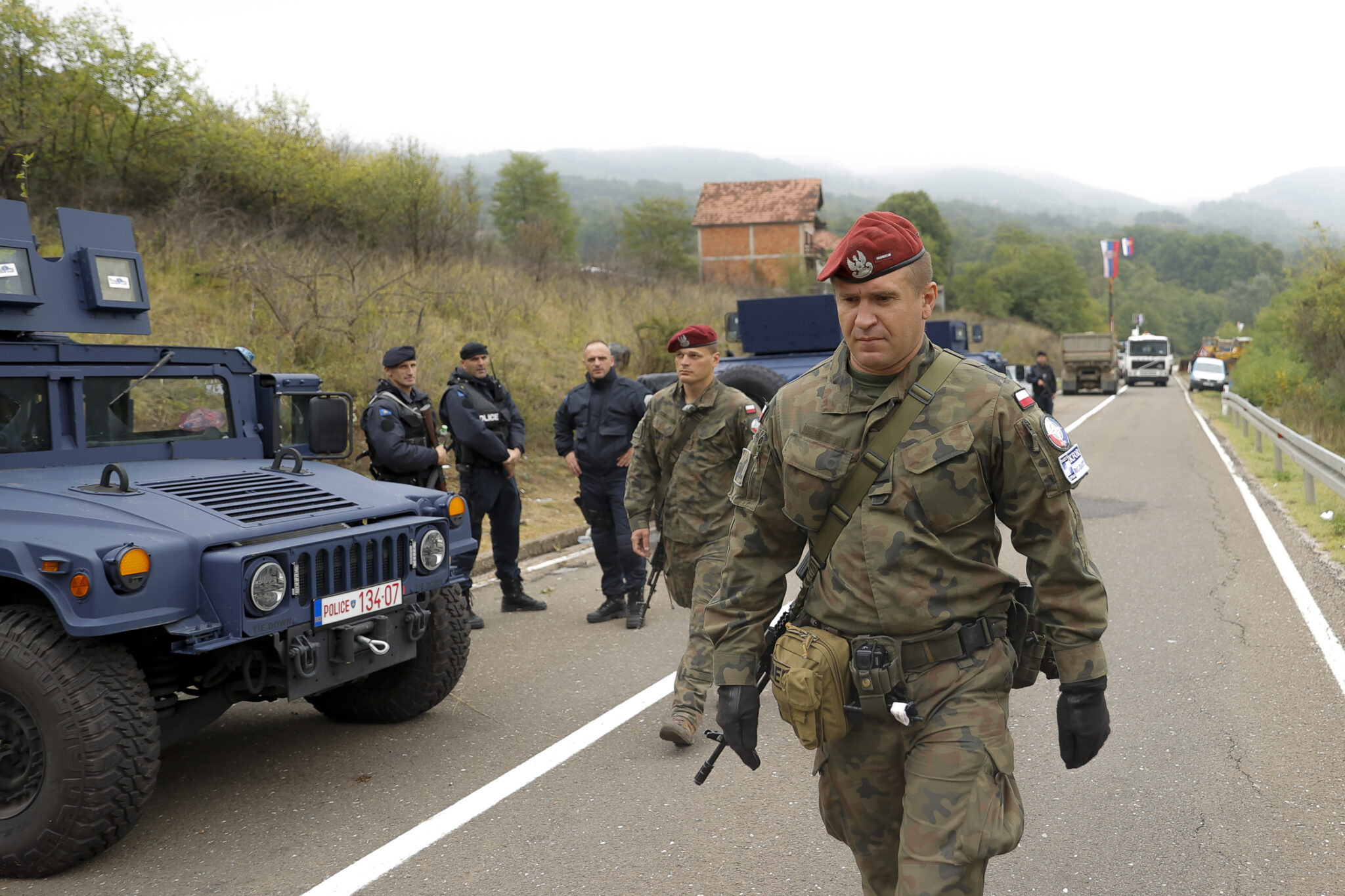 epa09492594 NATO peacekeepers patrol the area near the border crossing between Kosovo and Serbia in Jarinje, Kosovo, 28 September 2021. Kosovo Serbs in the northern part of the ethnically divided town of Mitrovica set up road barricades with trucks and cars to protest against the Kosovo government?s entry ban on vehicles with Serbian registration plates. EPA-EFE/VALDRIN XHEMAJ