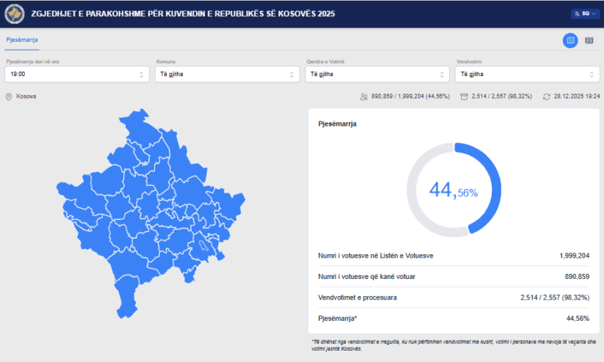 Sipas procesimit të më shumë se 98.3 për qind të vendvotimeve, të drejtën e votës e kanë shfrytëzuar 890, 859 qytetarë.