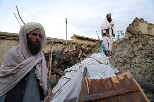 Afghans stand among destruction after an earthquake in Gayan village, in Paktika province, Afghanistan, Thursday, June 23, 2022. A powerful earthquake struck a rugged, mountainous region of eastern Afghanistan early Wednesday, flattening stone and mud-brick homes in the country's deadliest quake in two decades, the state-run news agency reported. (AP Photo/Ebrahim Nooroozi)