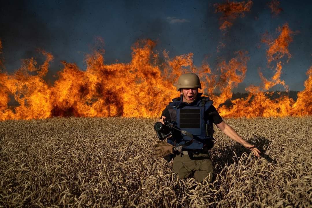 Ministria e Punëve të Jashtme të Ukrainës ka shpërndarë në një postim në Twitter, foton e një gazetari i cili qëndron në mes të një fushe me grurë e cila digjet.