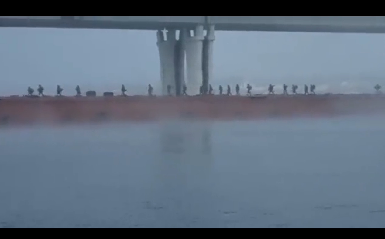 Në një video tjetër që qarkullon në rrjetet sociale duket se tregon trupat ruse duke kaluar lumin Dnipro në një urë ponton (lundruese) poshtë urës Antonivka.