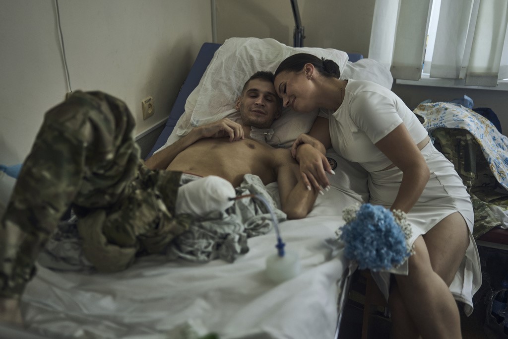 Topolnitsky Vlad, 26 vjeç, i cili u plagos rëndë në një betejë me trupat ruse dhe bashkëshortja e tij 22-vjeçare Hanna u fotografuan gjatë ceremonisë së tyre të martesës në një spital në kryeqytetin ukrainas.