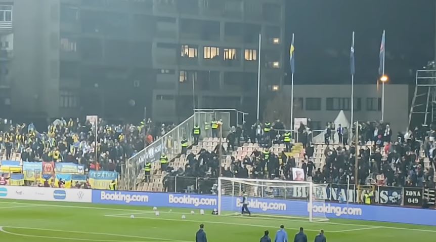 Kështu, ata u vërsulën të sulmonin tifozët ukrainas, duke sjellë edhe ndërhyrjen e policisë që u desh të përdorte edhe shkopinjtë e gomës për të qetësuar situatën. Palët u qetësuan vetëm kur boshnjakët panë se si tifozët ukrainas dogjën flamurin që mbanin mes tyre, duke kuptuar atëherë se bëhej fjalë për atë rus.