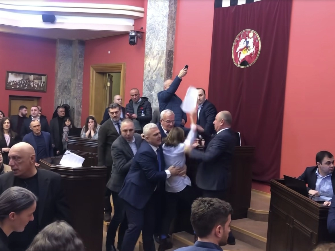 Videot e transmetuara nga brenda ndërtesës së parlamentit në Tbilisi treguan një përleshje të shkurtër, por të dhunshme midis ligjvënësve, kur kryetari i komitetit të çështjeve ligjore të organit u shfaq duke goditur kreun e partisë opozitare Lëvizja e Bashkuar Kombëtare, e cila kundërshton ligjin.