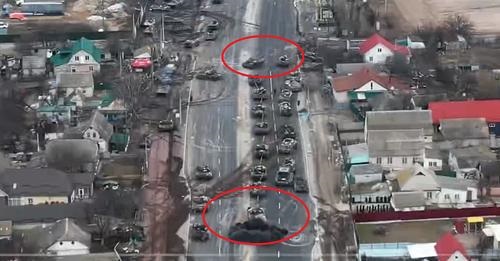 Sëfundmi, në mediat ukrainase po qarkullojnë pamjet e filmuara nga një dron pranë Kievit ku autokolona me tanke ruse goditet nga ukrainasit duke shkatërruar një pjesë të mirë të tyrë.