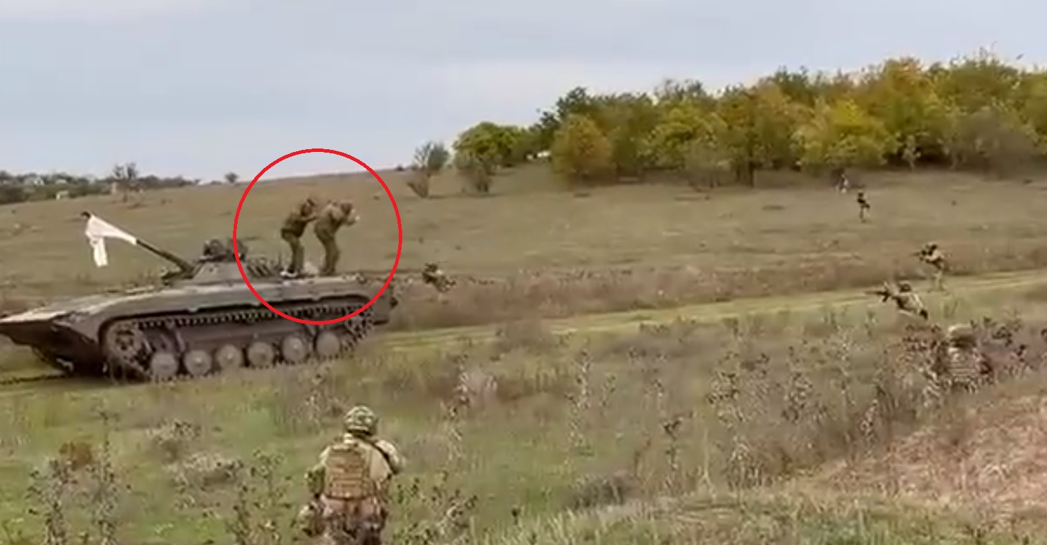 Gjatë kundërofensivës vërehen edhe dorëzime të rusëve, siç është edhe rasti i mëposhtëm ku disa ushtarë shkojnë drejt ukrainasve me një blind sipër të cilit kanë vendosur një flamur të bardhë.