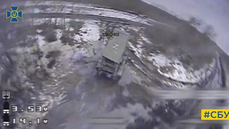 Në videon e publikuar nga ushtria ukrainase, shihet sistemi raketor duke shkrepur raketa, e pas tij lëviz një dron i cili përplaset në të dhe e hedhë në erë.