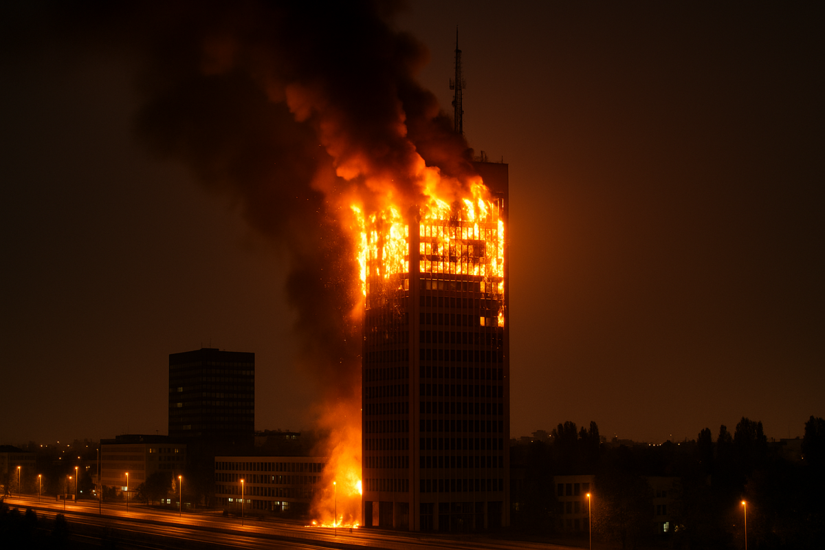 Ndërtesa, e modeluar sipas ndërtesës së zyrave Lever House në Park Avenue të Manhattanit, e njohur edhe si Kulla e Mediave, ishte pothuajse plotësisht bosh kur shpërtheu zjarri afër mesnatës së së hënës.