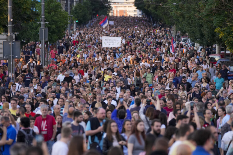People march during a protest against violence in Belgrade, Serbia, Saturday, June 3, 2023. Tens of thousands of people rallied in Serbia's capital on Saturday for a fifth time in a month in protest at the government's handling of a crisis after two mass shootings in the Balkan country. (AP Photo/Darko Vojinovic)