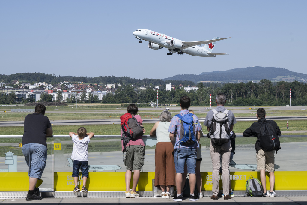 Menschen beobachten startende Flieger, aufgenommen am Samstag, 16. Juli 2022 auf dem Flughafen in Zuerich. (KEYSTONE/Ennio Leanza)