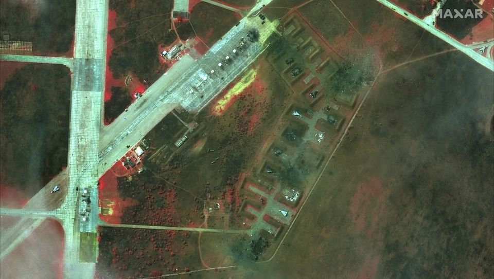 An infrared overview of damaged aircraft at Saki Airbase after attack, in Novofedorivka, Crimea August 10, 2022 . Maxar Technologies/Handout via REUTERS